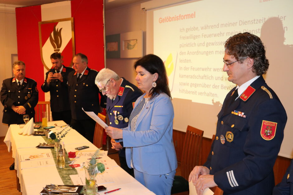 Neben den Berichten bietet die Jahreshauptversammlung auch die Möglichkeit, Neumitglieder vorzustellen, Jungfeuerwehrmänner anzugeloben sowie verdiente Kameraden zu befördern und auszuzeichnen.