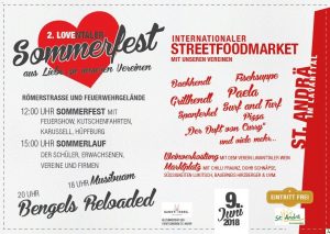 Am Samstag dem 09. Juni 2018 findet die zweite Auflage des „Sommerfestes der Vereine“ statt. Als Alternative zum St.Andräer Stadtfest wurde voriges Jahr zum ersten Mal von unserern St.Andräer Vereinen das Loventaler Sommerfest ins Leben gerufen. Auch heuer starten wir am Nachmittag mit dem internationalen Streetfoodmarket und einem Sommerlauf und feiern in den Abendstunden mit den Musibuam und Bengels Reloaded.